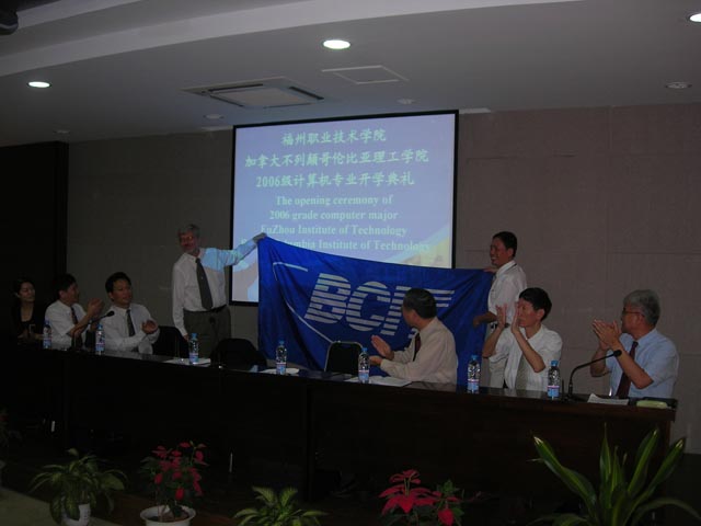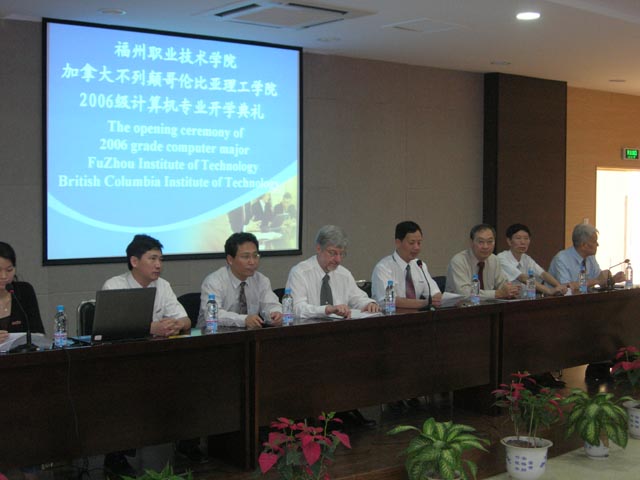10月20日上午,福州职业技术学院和加拿大不列颠哥伦比亚理工学院(BCIT)联合举办的2006级计算机专业开学典礼在综合楼学术报告厅隆重举行。BCIT副校长James Reichert博士、BCIT计算机学院院长Ken takagaki博士、BCIT国际部谷丰博士、院领导金昌余副院长、林福荣副书记、刘松林副院长出席了开学典礼。