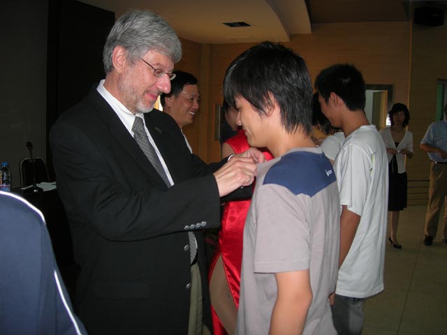 会上,学院领导和加拿大不列颠哥伦比亚理工学院代表共同为2006级中加班的每位同学配发了校徽。