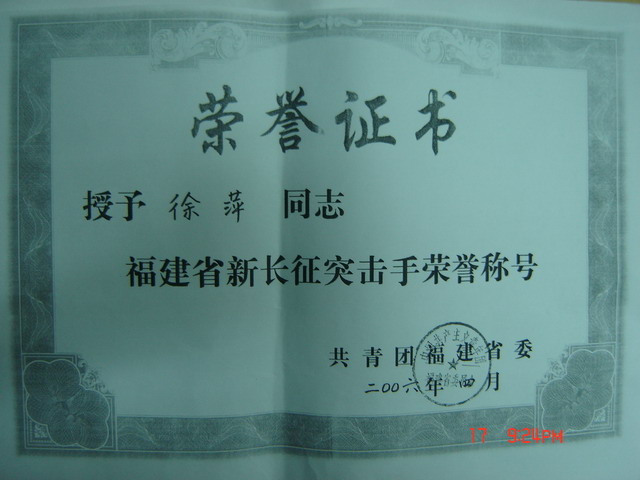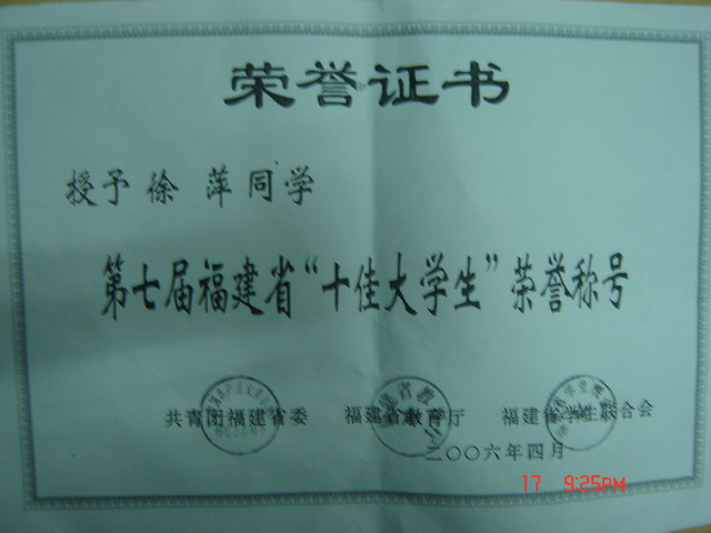 该同学在校期间,德智体美全面发展,各发面表现突出。2003—2004学年,获院“优秀团干”、院一等奖学金、院“三好学生”、“三好标兵”、院英语话剧比赛一等奖等荣誉;2004—2005学年,获“福建省优秀学生干部”、国家一等奖学金、院一等奖学金、全省大学生艺术节舞蹈大赛非专业组表演一等奖、全省大学生健美操比赛规定动作第七名、自选动作第三名、院英语技能比赛二等奖、系英语技能比赛一等奖、系日语技能比赛二等奖、院舞蹈比赛二等奖等荣誉。(应用外语系 06级商务日语(2)班郭晓雯)