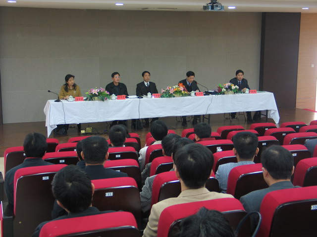 院党委书记俞云金(中)、院长孙芳仲(右二)、副院长金昌余(左二)、副院长刘松林(右一)、副院长詹碧卿(左一)出席新学期教职员工大会