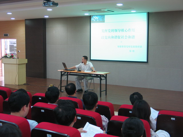 5月30日下午,在院学术报告厅举办“发挥党的领导核心作用,以党内和谐促社会和谐”专题讲座,邀请省委党校党建教研部政治学博士徐彬主讲,讲座由金昌余副院长主持。全体党员和中层干部认真听取了讲座。 徐彬博士从历史和现实两个维度阐述了党内和谐与社会和谐研究的缘起和重要意义,并详细分析了党内和谐与社会和谐之间的关系、党内和谐促进社会和谐的基本逻辑以及党内和谐促进社会和谐的基本困点。他指出,要实现党内和谐涉及党的思想建设、组织建设、制度建设和作风建设,与党内生活的各个方面紧密联系,必须从党的建设整体上予以推进。同时,要正确把握党内和谐与社会和谐的内在联系,切实发挥党的领导核心作用,以党内和谐促进社会和谐。徐彬博士的讲座为学院和谐校园的建设提供了理论上的指导和一定的借鉴作用。 在长达两个小时的讲座中,徐彬博士旁征博引、语言生动风趣,博得阵阵掌声,会场气氛热烈,反映强烈。 (党群人事处 林秀明)
