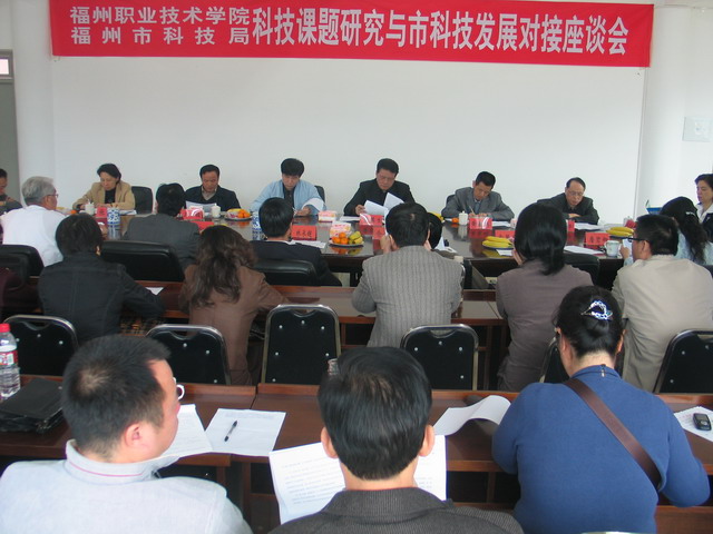 2008年11月14日上午,福州职业技术学院科技课题研究与市科技发展对接座谈会在学院综合楼举行。福州市科技局黄琪生局长带领黄春鹏副局长、林治良副局长、郑寿平副局长,吴亚镛副书记以及相关处室的负责人一行十人应邀出席了此次会议。我院俞云金书记、林承超院长、刘松林副院长、詹碧卿副院长、系部处室负责人及部分科研骨干参加了会议。会议由刘松林副院长主持。座谈会的具体组织工作由高教所负责。