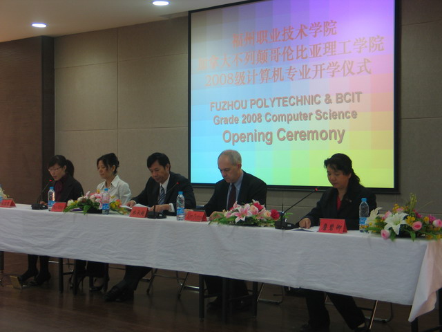 11月20日上午,福州职业技术学院与加拿大不列颠哥伦比亚理工学院(BCIT)联合举办的2008级中加合作班开学典礼在学术报告厅隆重举行。BCIT计算机学院院长Kim Dotto、BCIT亚洲合作项目经理Tracy Wang,福州职业技术学院院长林承超、副院长詹碧卿、党政办主任赵君尧、教务处处长林宁、计算机系全体教师与中加班学生出席了本次典礼。典礼由我院副院长詹碧卿主持。