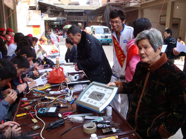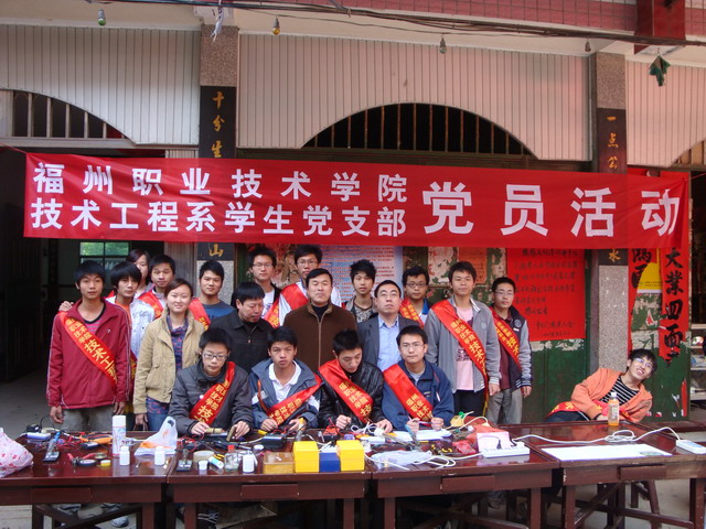 技术工程系学生党支部于2009年3月15日组织前往榕桥村开展“义务维修、服务大众”为主题的党员立项活动。本次活动由郭祥东老师、邵长军老师、邓华老师、辅导员刘思锶老师等带领学生预备党员、入党积极分子等20人参加。活动中,同学们各尽其责:有登记人员、维修人员、家电使用小窍门及安全用电宣传讲解人员。大家认真维修村民送过来的电器,积极宣传一些家电的安全使用常识。