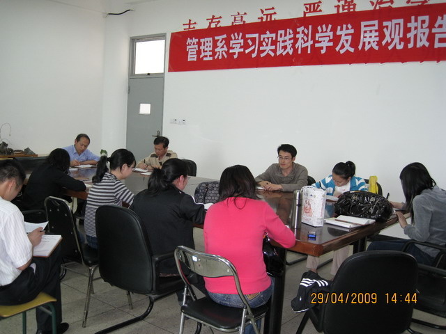 2009年4月29日下午,管理系党总支在系会议室组织召开全系教师党员学习科学发展观专题讨论,会上总支书记、学生支部书记、党员骨干教师等十余人积极讨论,踊跃发言。