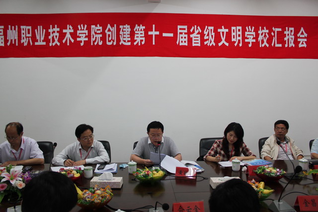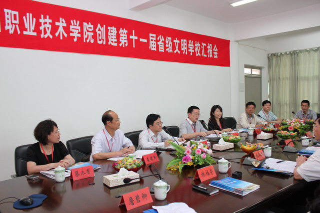 院长林承超教授主持汇报会,对考评组领导和专家表示热烈欢迎,院领导、各行政教辅部门及公基部负责人、各系党总支负责人参加了汇报会。院党委书记俞云金同志代表党政班子作学院创建省级文明学校工作汇报,一是完善机制,努力实现创建工作长效性,不断完善领导机制、目标责任机制、运行机制、投入机制。二是创先争优,党建工作扎实有效。创先争优和学习实践活动深入开展,学院领导班子建设得到加强,基层党组织建设进一步夯实,学习型党组织建设和党建理论研究取得新进展。三是以德为先,思想政治教育针对性和实效性不断增强。主题教育丰富多彩,思政课改革积极推进,实践育人成效显著,思政针对性不断加强,思想政治教育更加精细化,重视师德建设营造全员育人氛围。四是文化育人,校园文化建设成效彰显。励园文化建设取得新突破,学院《构建励志教育体系 彰显励园文化特色》荣获国家教育部2010年全国高校校园文化建设优秀成果奖。残健教育融合彰显校园爱心,融合校企文化提高职业素养,打造校园精品形成品牌项目,坚持礼仪教育提升文明素养,浓郁人文氛围强化环境育人,积极推进廉政文化进校园,文明共建取得阶段成效。五是以人为本,积极构建和谐校园。努力建设和谐工作机制,引导群团共建和谐学院,推进改革强化服务育人,积极构建平安校园,形成了良好的育人氛围,有效地推动学院事业科学发展。