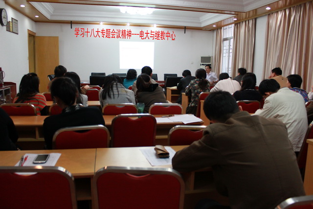 11月12日下午,电大与继教中心吴发水副主任作为福州市理论基地的一位专家,为本部门员工做了首场宣讲,与大家共同解读学习十八大胡锦涛总书记的工作报告,帮助大家深刻领会十八大提出的重大理论观点、重大战略思想、重大工作部署。悦人眼球的PPT、精彩简捷的讲解,无不鼓舞人心、催人奋进,大家认真倾听,并做好相关笔记。几位党员还就学习十八大精神作了发言,谈了学习体会,大家一致认为,要在思想上高度重视,把好学习关;更要在行动上立足本职,做好服务事。