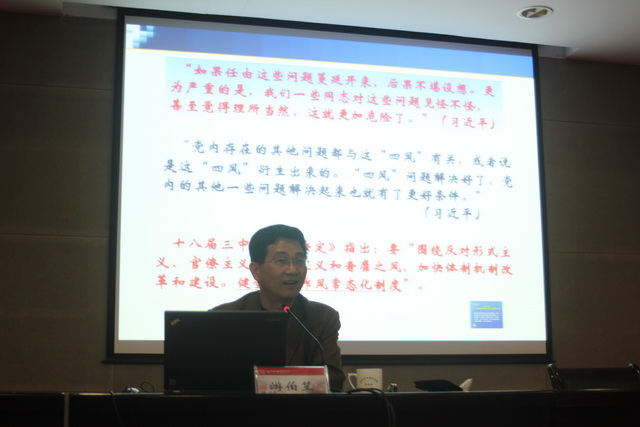 为进一步强化理想信念教育、政治纪律教育、优良传统教育、从政道德教育,深化对“廉洁执政执教、为民务实清廉”的理解和认识,2013年11月27日下午,我院特邀市委党校副校长游伯笙教授在综合楼学术报告厅为全院教职工党员上了一堂题为“坚持党的群众路线、切实转变工作作风”的廉政教育专题党课。专题党课由院纪委书记沈锦华同志主持。