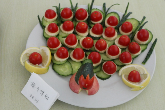 比赛包括策划、选材、拼盘、解说环节。同学们用苹果、香蕉、西红柿等各种各样的水果参赛,他们充分发挥想象力和创造力,凝结集体的智慧共同完成参赛作品。经过两个多小时的脑力比拼和手工创作两个环节,比赛落下了帷幕,8#306、9#305、8#206三间宿舍脱颖而出,分别获得冠、亚、季军。