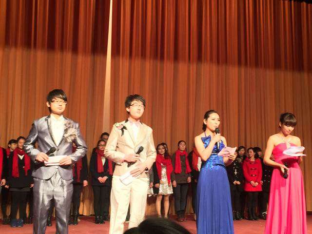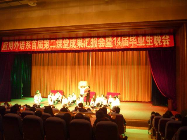 2013年12月25日晚,应用外语系在学院500人礼堂隆重举行应用外语系首届第二课堂成果汇报会暨2014届毕业生晚会,学院工会副主席兼督导室主任杨震、人文社科系贾同恩书记等领导莅临晚会指导,应用外语系全体师生观看了晚会。