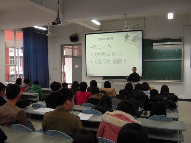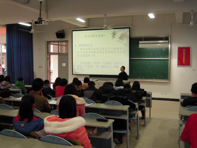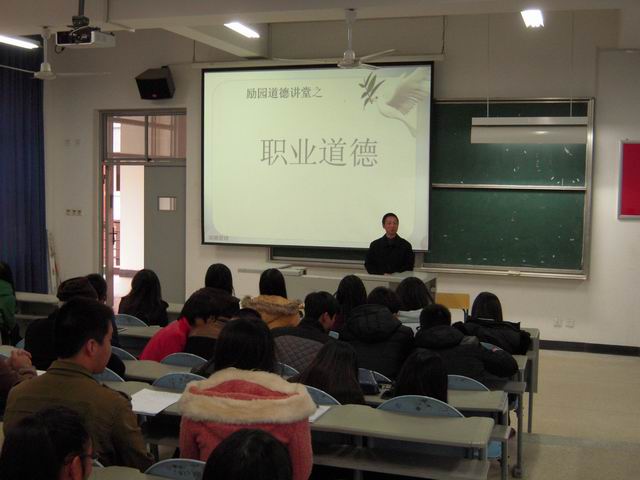 为提高学生的职业道德,做好就业准备,2013年12月25日下午,经济系在2#楼309教室举办了励园道德讲堂之职业道德专场,讲座主题为“职业道德促进人的自身发展”,讲座邀请经济系教师党员、投资理财专业张兴夏副教授主讲。投资理财专业的相关学生参加了讲座。