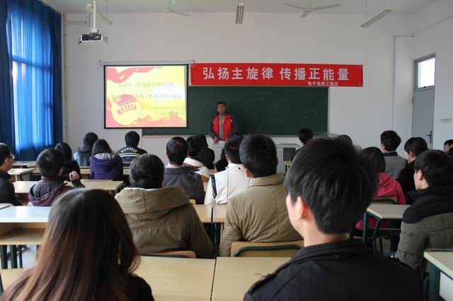 2013年12月30日晚,电子信息工程系团总支组织召开贯彻共青团中央书记处第一书记秦宜智同志在全国高校共青团工作研讨班上讲话精神的学习会。会议由系辅导员汤绍康主持,团总支委员、学生会骨干、各班级团支书参加了此次会议。