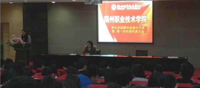 2014年1月2日,经过近一个月的紧张筹备,福州职业技术学院学生社团联合会成立暨第一次代表大会胜利召开。本次代表大会共有10个代表团89名学生代表参加。其中院社团部代表团 10人,其他79名学生代表均由各系民主推选产生。在各代表中,男代表52人,占代表总人数的58.4% ,女代表37人,占代表总人数的41.6%,具有广泛的代表性。