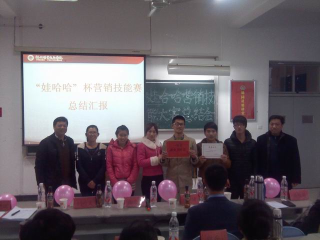 经过营销方案策划和一个月的校内外实战销售,福建省“娃哈哈”杯第三届大学生市场营销技能大赛福州职业技术学院赛区的比赛圆满落下帷幕。2013年12月25日下午,在2号教学楼509教室迎来了本次比赛的最后一个环节——市场营销技能大赛总结汇报暨颁奖典礼。来自娃哈哈福建省分公司福州拓展队的姜斌队长和市场营销专业的全体教师担任本次比赛的评委,各团队围绕竞赛的计划、取得的成绩、存在的问题和原因、建议等内容谈了各自的体会和感受。经过激烈角逐,虞超等6位同学组成的天涯队获得一等奖,张熙晨等6位同学组成的夕阳西下几时回队、张瑜等6位同学组成的酷跑队获得二等奖,胡锦瑞等6位同学组成的青年队、林少杰等6位同学组成的娃娃哈队、陈思国等6位同学组成的啦啦队获得三等奖。商贸系的陈宝龙副书记、闫丹文副主任、娃哈哈福州分公司的姜队长及市场营销专业教师为获奖队伍颁发奖状和奖金。闫丹文副主任做了总结发言,他要求同学们以更积极的态度、更专业的表现面对学习和竞赛,争取取得更大成绩。