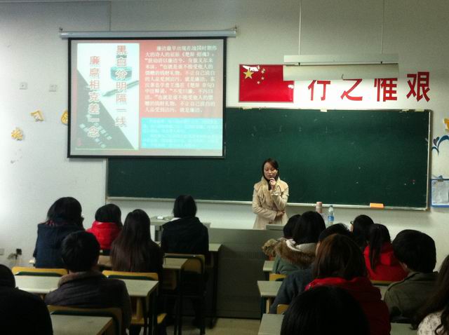 吴雪飞老师围绕习近平总书记在中纪委第二次全体会议上的讲话精神,向同学们介绍了“廉政文化”的概念以及廉政与文化的关系和历史意义,也向大家讲述了廉政故事、介绍了与廉政有关的名言警句以及在校大学生对廉政文化建设的态度和应尽的义务。帮助同学们进一步认清了目前反腐倡廉工作的紧迫性,倡导青年们从自身做起,培养廉洁理念,树立廉洁意识,切实做好廉洁文化建设,营造“以廉为荣、以廉为美、以贪为耻”的校园氛围。