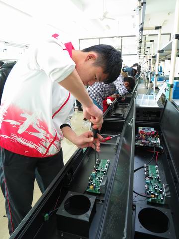 在为期3天的实习期间,计算机应用技术专业30名同学被分配到各个工艺流程轮岗实践,分别在配件组、适配器生产组、中控电脑拼装组、面板接线组、QC组等岗位。虽然被分到不同的部门岗位,但是大家相互分工合作,共同完成生产任务。这次实习是教学与生产、理论与实践相结合的重要突破,将计算机应用技术专业同学的计算机运维技术、计算机芯片维修技术在产品生产过程中得到训练与提升;同时在生产实习过程中,着力培养学生在实践中发现问题、思考问题、解决问题的能力以及在生产实践中学习的能力;培养学生的团队合作精神,树立集体意识,提升职业素养。