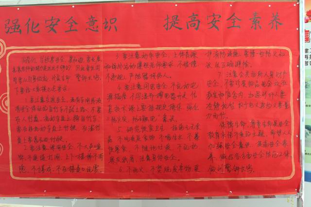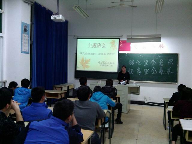 电子信息工程系制作了“强化安全意识,提升安全素养”的专题宣传栏,摆放在实训楼入口处,对全系师生进行宣传。全系各班级按照活动要求,结合自身班级实际情况,开展的形式多样、内容丰富的主题班会活动,主题教育内容均涉及到有关交通、饮食、消防、网络、生命健康、安全防范等方面的一系列问题。此外,系领导组织学生干部对全系的教室、实验室、宿舍进行安全大检查,排除安全隐患。
