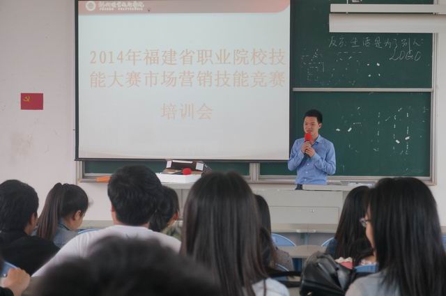 经过1个多月的等待,由福建省教育厅等主办、福建对外经济贸易职业技术学院承办、娃哈哈集团福建分公司赞助的2014年福建省职业院校技能大赛营销基本技能竞赛终于揭开了面纱,该赛项将于2014年4月1日至30日举行,分成校内初赛和省级决赛两个阶段,包括营销策划、商品销售和总结等环节。为了帮助学生更好地备战和比赛,3月27日下午,商贸系邀请娃哈哈公司福州拓展队的姜斌队长给学生做了产品知识、市场状况、营销理念、销售方法与技巧、注意事项等方面的培训,并就送货、跨区域销售等大家关心的问题进行了深入沟通交流。市场营销专业曾繁斌老师也强调了本次比赛是首次列入省赛和国赛正式比赛项目,该项目提供了一个进行营销实战的平台,能帮助市场营销专业学生有效提升营销综合实战能力。