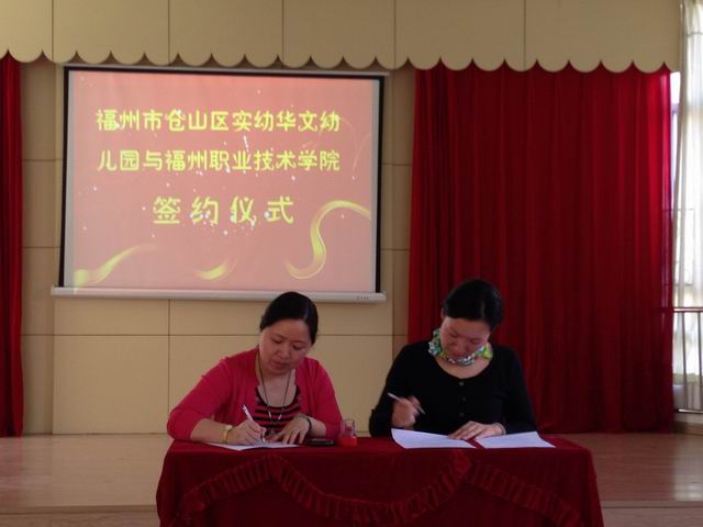 为适应社会对幼儿外语教育方向人才的需求,培养合格人才,密切校企合作,建立稳定的学生社会实践基地,经过双方的积极筹备,福州职业技术学院应用外语系与福州市仓山区实幼华文幼儿园于2014年4月11日在实幼华文幼儿园举行学生社会实践基地签约暨授牌仪式。应用外语系辅导员韩燕霞和实幼华文幼儿园的黄婧副园长分别代表校企双方进行了签约并互授牌匾。参加签约活动的还有系辅导员黄燕姿和2013级部分学生。