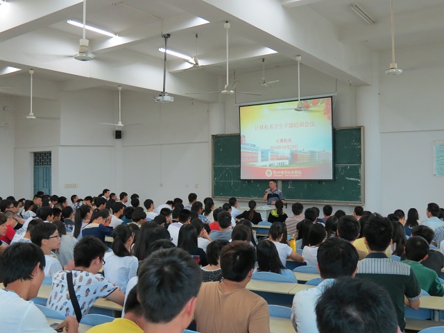 为进一步提高计算机系学生干部的思想道德素质、组织能力、领导能力,规范学生干部的带头作用,加强学生干部的良好服务作风,2014年10月29日,计算机系在一号教学楼501隆重召开学生干部培训大会。会议由系党总支副书记陈建国主持,辅导员、各班班委和两委干部全部出席会议,