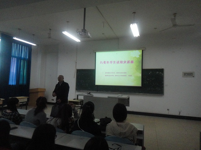 为进一步提升学生的职业道德素养,加强学生职业道德观念,人文系于2014年11月12日下午在综合楼310多媒体教室举办了以“与青年学生谈职业道德”为主题的职业道德讲座。讲座邀请了来自福建能源集团高级经济师邱登辉老师作为主讲人,人文系一百多名学生听取了讲座。