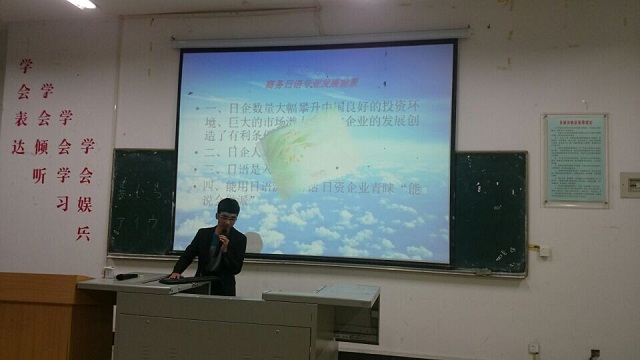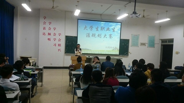 为加强学生对当前就业形势的了解,帮助他们了解社会求职状况,明确就业目标,增强就业技能,更好地指导学生进行职业生涯规划,进一步提高就业竞争力及做好未来的就业准备,2014年11月20日晚,应用外语系在实验楼211多媒体教室举办大学生职业生涯规划大赛。比赛主要参赛者为应用外语系大一学生,辅导员刘秀钗老师和部分学生会两委干部担任评委。