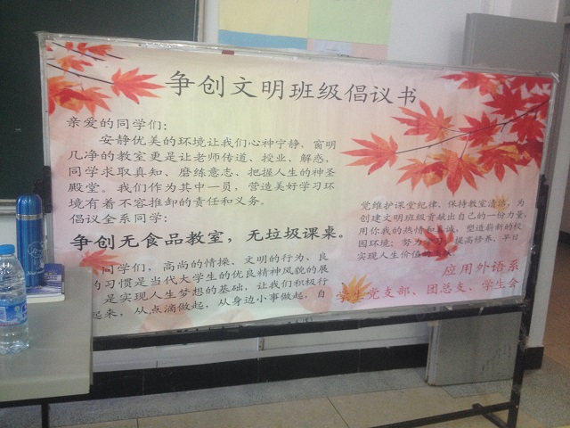 文明礼仪不仅是现代文明人必备的基本素质,也是做人的基本要求。为提高学生的文明礼仪修养水平,养成良好的文明行为习惯,优化学习和成长环境,使大家能全身心地投入到紧张的学习生活中去。2014年11月21日中午,应用外语系在综合楼110教室开展了争创文明班级承诺签名活动。签名活动由应用外语系学生党支部、团总支、学生会联合发起,全系学生积极响应参与。