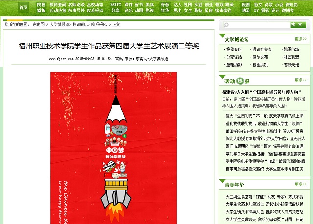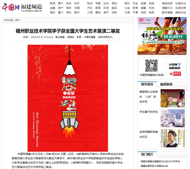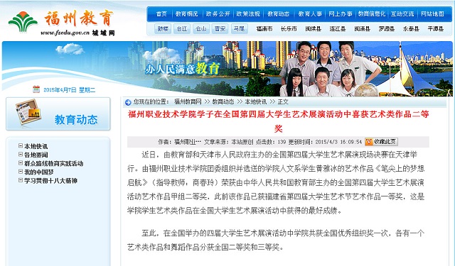东南网4月2日讯(通讯员 官禹)近日,由教育部和天津市人民政府主办的全国第四届大学生艺术展演现场决赛在天津落幕。由福州职业技术学院团委组织并选送的人文系学生黄雅冰的艺术作品《笔尖上的梦想启航》(指导教师:商春玲)荣获全国第四届大学生艺术展演活动艺术作品甲组二等奖。此前该作品已获福建省第四届大学生艺术节艺术作品一等奖,这也是该学院学生艺术类作品在全国大学生艺术展演活动中获得的最好成绩。 东南网链接: http://i.fjsen.com/2015-04/02/content_15894803.htm 福州教育网报道: