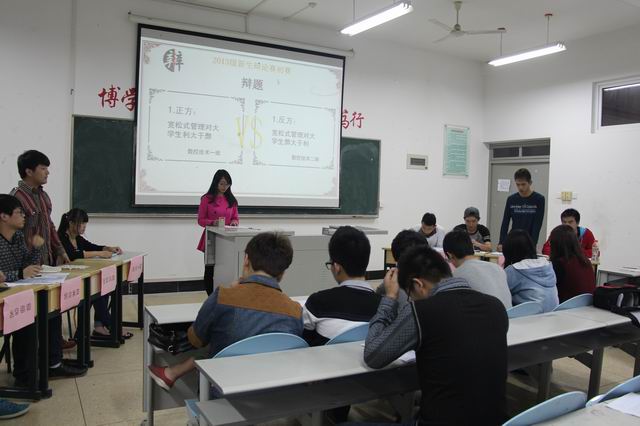 2014年4月8日晚7:00,学院综合楼411教室热闹非凡,机械工程系第二届辩论赛正在如火如荼地进行着,双方辩手围绕着“城市化能否使人们的生活质量提高”展开唇枪舌战。