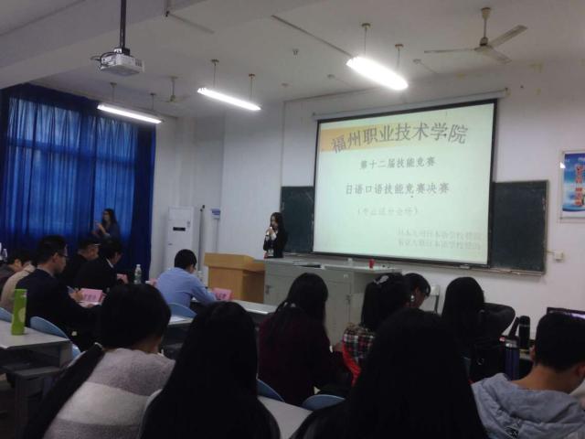 2015年12月2日,应用外语系十二届日语口语技能大赛在实验楼211多媒体教室举行,大赛邀请到了日本九州语言学院校长李明先生和钟子申女士以及日本大原教育集团代表林琪先生担任大赛嘉宾评委,参加决赛的七名选手来自商务日语专业,应用外语系商务日语专业全体学生到场观摩。