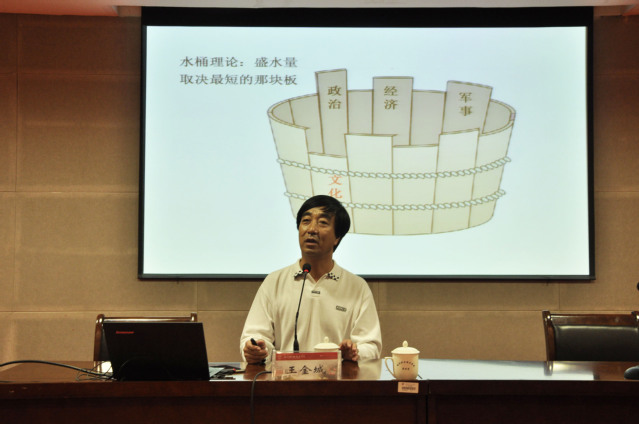 王教授对于当代文化颇有研究,曾先后主持或参与多项省级科研课题,发表学术论文150余篇,多篇被《新华文摘》、人大复印资料转载,出版了多部学术著作,有着丰厚学术积累与研究经验。王教授主要围绕“大国崛起、文化战略、文化目标、文化热战”进行论述,他认为要实现文化目标,中国必须具有坚定的文化自信,做出文化输出与文化安全的文化战略部署,参与世界文化对话,参与国际事务,增加话语权,提升文化软实力,同时强调,在21世纪的文化热战中,要警惕美国的文化霸权。面对21世纪全球文化战略格局,我们将如何提升软实力、如何进行文化输出、如何实现文化目标,引发了思考。