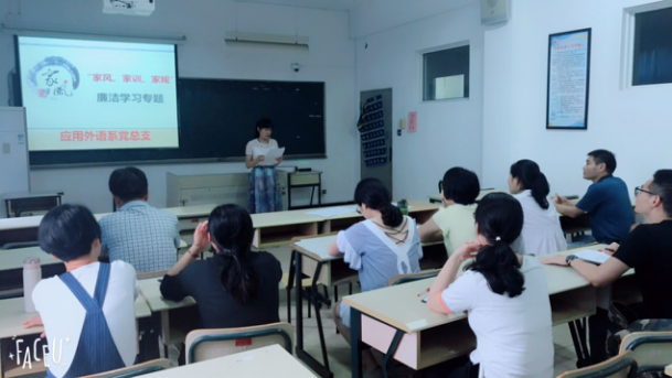 家庭是传承中华传统美德的基本场所,家训家规充满着中华民族传统美德,为弘扬中华优秀传统文化,传播社会主义核心价值观,营造家风好、民风纯、党风正、政风清的良好氛围,2017年6月21日下午,应用外语系党总支在综合楼204教室,开展了“家风、家训、家规”廉洁教育活动,由李燕燕副书记主持,全体教师党员参加此次活动。