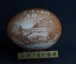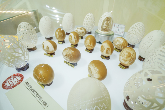 蛋雕是在各类蛋壳上雕刻出的精美作品,本展品为福州职业技术学院听障学生所作,体现出我校聋生自强梦、工匠梦、中国梦。参展作品分为两种材质,鹅蛋适合镂空雕刻,体现形式美感,鸡蛋适合做浮雕,刻画具体形象。本展品用鸡蛋做成两组主题浮雕以展现十八大以来的发展成就,置于展台中心位置,以鹅蛋镂空雕作品作为配饰,环绕周围,加强形式美感。