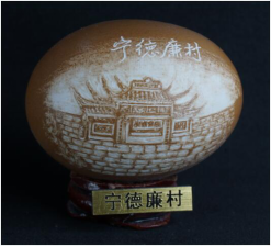 本次参展作品的主题为“清新福建,我爱我家”,选取红色文化--古田会址,廉政文化--宁德廉村,扶贫典型--下党村,人文建筑--三坊七巷、土楼,历史人物--林则徐、林觉民、冰心,当代楷模--谷文昌、廖俊波,不同视角体现聋人心中家乡之美。展品分为两种材质,用鸡蛋做成主题浮雕,置于圆形展台中心,以鹅蛋镂空雕作品作为配饰,环绕周围,加强形式美感,体现出聋人心中的自强梦、工匠梦、中国梦。