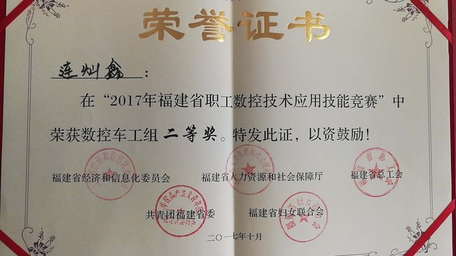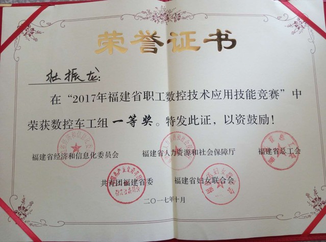 历时3天的2017年福建省职工数控技术应用技能在泉州落下帷幕。此次比赛由省经信委、人社厅、总工会、团省委、省妇联等部门主办,省机械工业联合会承办,福州职业技术学院等单位行校企共同协办。机电工程学院共有4位师生参赛(1名教师、3名毕业生),参赛师生以扎实的理论基础、娴熟的技能操作、精确的加工精度、昂扬的比赛风貌在99名参赛选手中脱颖而出,斩获佳绩:教师连灿鑫获得数控车工赛项二等奖、毕业生杜振龙获得数控车工赛项一等奖(第一名);毕业生柯连铤、张圣滨均获加工中心赛项二等奖,获奖总数、获奖成绩居60余家参赛单位首位。