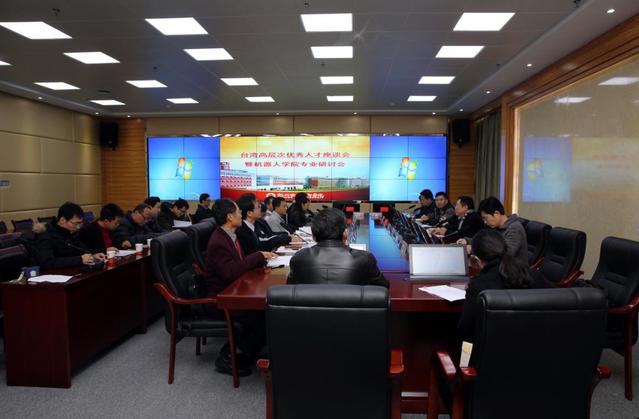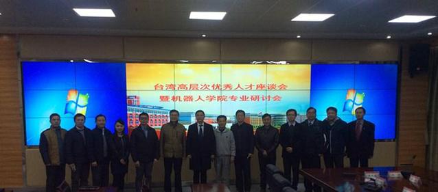 为加快学校师资队伍建设,打造高层次人才队伍, 12月22日上午,学校召开了台湾高层次优秀人才座谈会暨机器人学院专业研讨会,共有10名台湾高层次人才参加座谈会,校党委书记林子波、校长李秋斌、副校长刘松林、欧阳少鸣及教务处、人事处、产学研与实训中心等相关部门领导、机器人学院专业教师及企业方代表参加了座谈会,李秋斌校长主持会议。