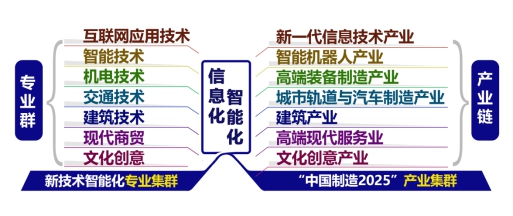 学校主动服务福州产业结构转型升级,明晰“强化工科专业,优化现代服务业专业,培育战略性新兴产业专业”的专业发展定位。坚持“契合产业设专业、产教融合建专业、凝练特色强专业”的专业建设理念,适度超前,动态调整专业结构。围绕区域产业带和产业链,以优势特色专业为基础,形成了对接福州七个主导产业群的七个专业群,以信息化、智能化为纽带,将七个专业群链成一个新技术智能化专业集群对接“中国制造2025”产业集群。