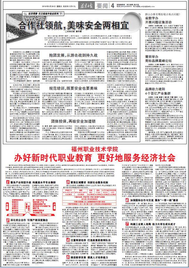 2018年9月28日,《福建日报》第四版要闻版面刊登《福州职业技术学院:办好新时代职业教育 更好地服务经济社会》,介绍我校办学成果。
