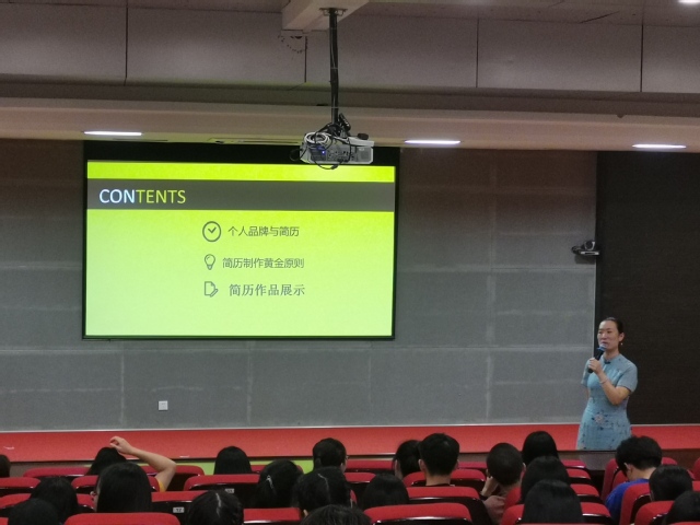 讲坛以打造个人职业品牌为出发点,剖析个人品牌与简历之间的重要关系,并从学生求职实际出发,分析简历制作的黄金原则以及如何具体、简洁、条理地做出金牌简历,敲开求职路上的第一扇大门。韩老师还鼓励学生简历是用脚走出来的,大学三年应尽早制定目标,一步一脚印,为未来步入职场打造丰富的经历。