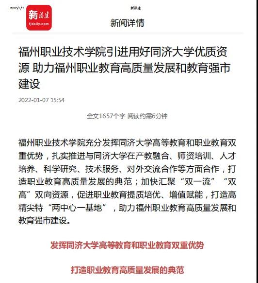 近期,新福建、福州日报、福州电视台、中国高职高专教育网等多家主流媒体对我校“引进用好同济大学优质资源 助力福州职业教育高质量发展和教育强市建设”工作进行集中报道,受到社会各界广泛关注。