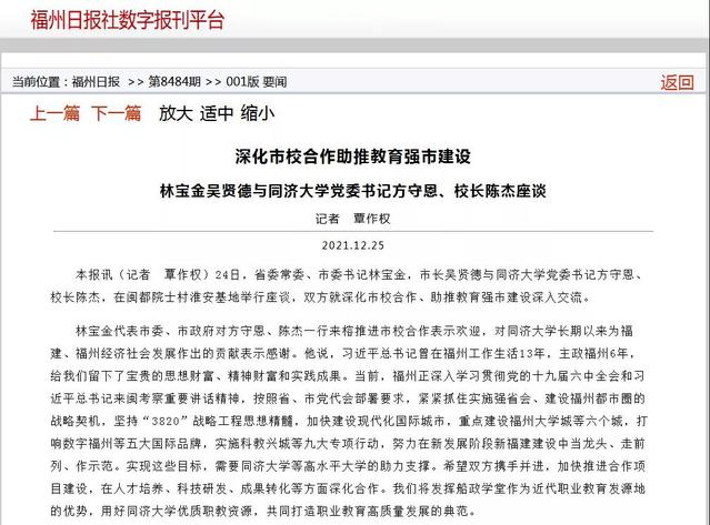 福州日报:深化市校合作助推教育强市建设 林宝金、吴贤德与同济大学党委书记方守恩、校长陈杰座谈
