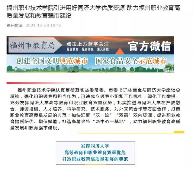 福州教育微信:福州职业技术学院引进用好同济大学优质资源