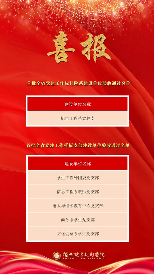 近日,福建省委教育工委公布首批全省高校党建工作标杆院系、样板支部验收通过名单,我校机电工程系党总支通过“全省党建工作标杆院系”建设单位验收,信息工程系教师党支部、电大与继续教育中心党支部、商务系学生党支部、文化创意系学生党支部通过“全省党建工作样板支部”建设单位验收,已通过教育部验收的“全国党建工作样板支部”学生工作处团委党支部视为通过省级验收。