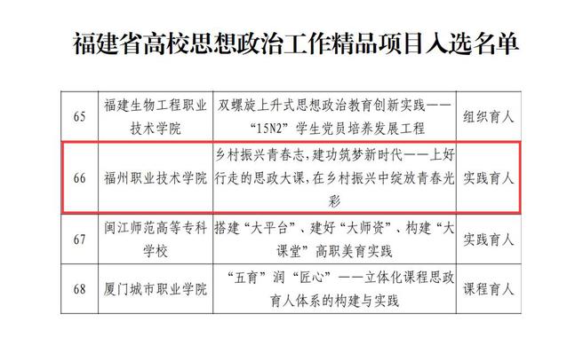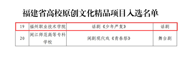 近日,中共福建省委教育工委公布了2022年福建省高校思想政治工作精品项目、高校原创文化精品项目、高校网络教育名师入选名单(闽委教思〔2022〕36号),我校实践育人项目《乡村振兴青春志,建功筑梦新时代——上好行走的思政大课,在乡村振兴中绽放青春光彩》入选福建省高校思想政治工作精品项目,话剧《少年严复》入选福建省高校原创文化精品项目。