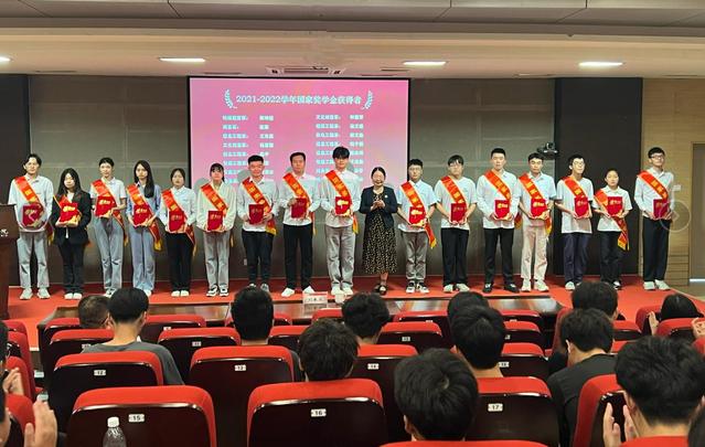 会上宣读了2021-2022学年国家奖学金、国家励志奖学金获奖学生名单。副校长刘春兰为及各二级院系党总支书记为获奖学生代表颁发证书。