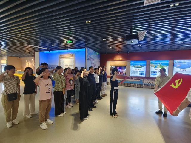 随后,党员同志们来到松山围垦精神展示馆,大家满怀敬仰之情仔细聆听“松山围垦”发展历程,感悟三代建设者历经艰辛、锲而不舍的奋斗精神。受到围垦精神的鼓舞,党员们在特殊教育系李燕燕副书记的带领下,面对鲜红的党旗和庄严的誓词,共同高举右拳,庄严宣誓。