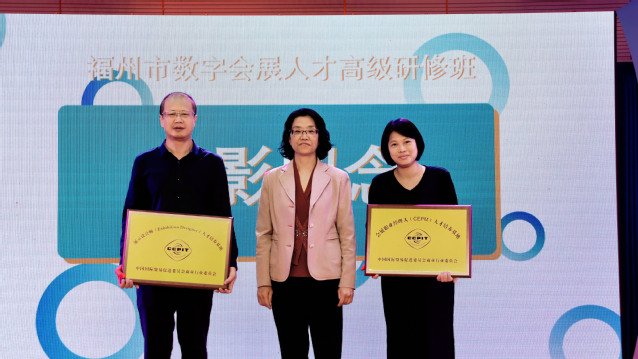 此次培训受到中国国际贸易促进委员会商业行业委员会认可支持,并向福州职业技术学院、福州市会展行业协会授予会展职业经理人、展示设计师等证书人才培养基地牌匾。
