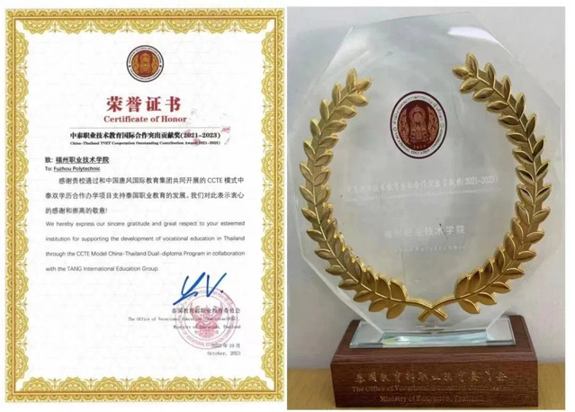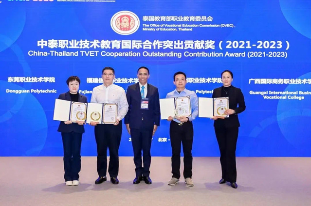 近日,第24届中国国际教育年会在北京国家会议中心召开,教育部部长怀进鹏出席全体大会开幕式并致辞。会上,我校荣获“中泰职业技术教育国际合作突出贡献奖(2021-2023)”。该奖项是泰国教育部职业教育委员会认定的国家级奖项,由泰国教育部职业教育委员会副秘书长宋鹏·班丹先生颁发。