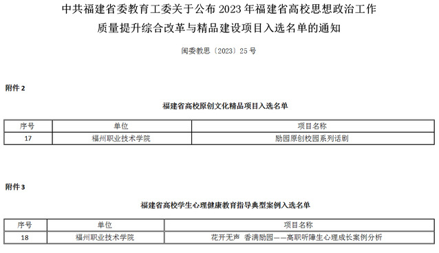 近日,中共福建省委教育工委公布了2023年福建省高校思想政治工作质量提升综合改革与精品建设项目入选名单,我校团委、公共教育部申报的项目《励园原创校园系列话剧》入选福建省高校原创文化精品项目,特殊教育系、学生工作处申报的案例《花开无声 香满励园——高职听障生心理成长案例分析》入选福建省高校学生心理健康教育指导典型案例。