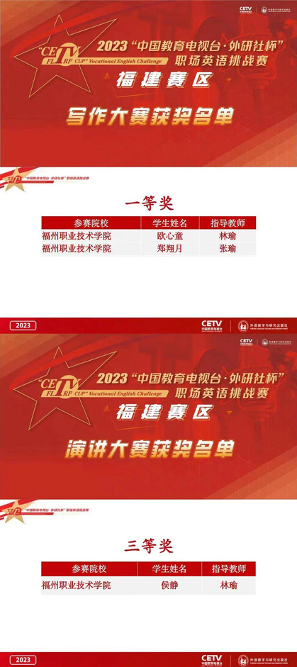 日前,2023“中国教育电视台·外研社杯”职场英语挑战赛演讲、写作大赛福建赛区决赛落下帷幕。我校商务系跨境电商专业学生欧心童(指导教师:公共教育部职业外语教研室林瑜)、郑翔月(指导教师:公共教育部职业外语教研室张瑜)荣获写作比赛一等奖,文化创意系旅游管理专业学生侯静(指导教师:公共教育部职业外语教研室林瑜)荣获演讲比赛三等奖。